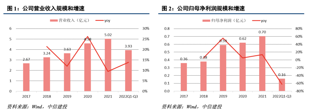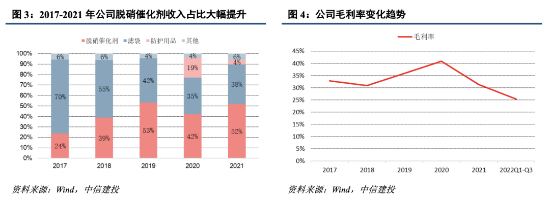 公司主要從事過濾材料、煙氣凈化系列環(huán)保產(chǎn)品的研發(fā)、生產(chǎn)、銷售,主要產(chǎn)品為各類耐高溫耐腐蝕濾袋和 SCR 脫硝催化劑,可應(yīng)用于電力、鋼鐵及焦化、垃圾焚燒、水泥和玻璃等行業(yè)。2017-2021年公司營業(yè)收入CAGR為17.11%,歸母凈利潤CAGR為18.35%。