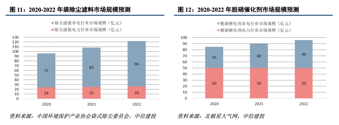 電力行業(yè)受益煤電投資,非電行業(yè)占比提升。電力為公司第一大業(yè)務(wù),電力存量市場穩(wěn)定,濾袋、脫硝催化劑市場規(guī)模分別為25、50億元左右,在保供+調(diào)峰的迫切需求下,煤電投資開始重回增長,未來幾年新增煤電機組有望觸底反彈,為電力行業(yè)濾袋和脫硝催化劑帶來新增安裝需求。非電行業(yè)如鋼鐵、水泥、垃圾焚燒、平板玻璃、陶瓷、非電燃煤鍋爐等將成為超低排放改造的主戰(zhàn)場,提供主要增量,特別是水泥賽道,省市政策尚未完全跟進(jìn),催化劑整體改造率不足10%,空間廣闊。預(yù)計2022年非電行業(yè)濾袋、脫硝催化劑市場規(guī)模分別為100、50億元左右,公司產(chǎn)品從以電力行業(yè)為主向電力和非電協(xié)同發(fā)展轉(zhuǎn)變,目前非電行業(yè)收入占比超過50%。隨著國家環(huán)保政策趨嚴(yán),競爭能力較弱的中小企業(yè)將不斷退出,公司隨著產(chǎn)能擴張逐步落地,市占率有望持續(xù)提升。