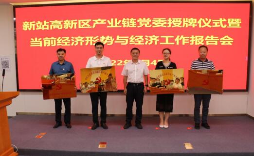 2022年8月,新站高新區(qū)舉行產(chǎn)業(yè)鏈黨委授牌儀式暨當(dāng)前經(jīng)濟(jì)形勢與經(jīng)濟(jì)工作報告會,圖為區(qū)黨工委委員、管委會副主任高同國向區(qū)集成電路、新型顯示、高端裝備制造、節(jié)能環(huán)保四大產(chǎn)業(yè)鏈黨委授牌