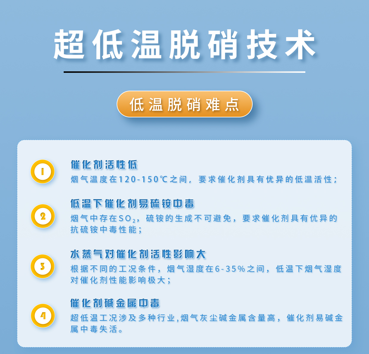 | 適用工況 | 低溫?zé)煔夤r,僅要求煙氣溫度≥120℃;煙氣含水量差異大,可達(dá)在10%~40%(vol%);可適應(yīng)危廢焚燒行業(yè)、垃圾焚燒行業(yè)、白灰行業(yè)、鋼鐵行業(yè)工況煙氣超低溫脫硝; |